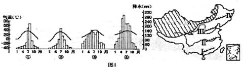 5、单选题 图是我国四个地方(①-④)的年内各月气温与降水量图(四地均位于平原,且受东部雨带的影响);图5为“我国东部季风区雨带推移规律示意图”。读图回答问题。