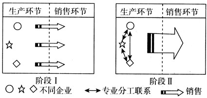 1、阶段I该地区企业生产特点有①专业分工程度低②总体生产能力强③各企业团结协作④各企业联系少