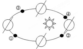【小题2】根据图中地轴倾斜方向可知,左侧位置太阳直射北回归线,为夏至日,地球逆时针自转,因此下方位置为秋分日,右侧位置为冬至日,上方位置为春分日,分别为6月22日前后、9月23日前后、12月22日前后、3月21日前后。因此会议期间,地球在公转轨道面上的位置接近②。