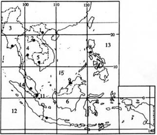 (1)马来群岛多火山,其主要原因是什么?(2分) (2)近年来,发达国家的不少汽车公司纷纷到马来西亚投资,开办轮胎制造厂,试分析其原因(2分) (3)美国微电子装配工业在东南亚地区布局的主要原因是什么?(2分) (4)图家6是世界上最大的群岛国家,属于?气候,成因是??。 (2分) (5)本区的主要粮食作物是??,评价其发展的条件。(5分)