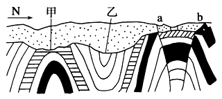 (2)在地貌上,甲构造顶部岩层缺失的原因是______________________________,褶皱构造上覆盖有岩石是由____________作用形成的。据此,可推断这一地区的地壳运动情况为__________________________。