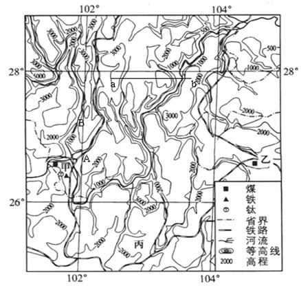 (2)乙处是(六盘水)煤矿,开发过程中,排放大量的二氧化硫,2分,该地区地形较闭塞(山地盆地为主),2分,常年气候湿润,2分,易形成酸雨。共6分