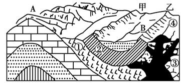 (2)A处的地质构造常形成?(地形),喜马拉雅山、泰山、阿尔卑斯山的构造与A相似的是?。B处往往形成?地貌,如我国的?。