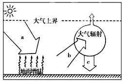 【小题2】据大气受热过程图可知:a表示到达地面的太阳辐射;b表示地面辐射,把热量传递给大气;c为大气逆辐射。地面辐射是近地面大气主要的直接热源,A错;太阳辐射为短波辐射,地面辐射为长波辐射,B正确;大气中的水汽和二氧化碳吸收地面长波辐射,臭氧吸收太阳辐射中的紫外线,C错;c大气逆辐射主要受云量的影响,云量越大,大气逆辐射越强,D错,所以本题B正确。
