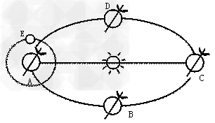 ? 图中实线表示地球围绕太阳公转的轨道,圆形虚线表示月球围绕地球公转的轨道,地球以每天约1。的速度在轨道上自西向东运行。当地球从A运行至B时,月球正好自M1至M2绕地球公转了一周。