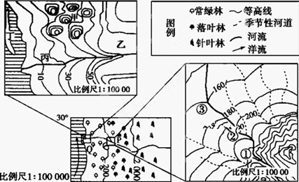 5、单选题 下图为某地区自然景观分布示意图,以及P、Q两区域的等高线图,读图回答下列各题。