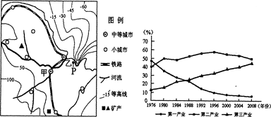 1、综合题 (12分)读 “我国东部沿海某地区城市分布图”(左图)和该地区“1976年-2008年产业结构变化图”(右图)。回答下列问题: