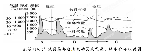 (1)B地形区内与同纬度地区相比,冬夏气温偏?(高、低);其主要原因是?(4分)
