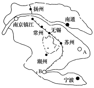 本题解析:这是一幅长江三角洲及其附近的城市分布图。图中A为上海市,是全国最大的城市,服务范围最大,能影响整个国家。B为杭州市。图中城市多沿河设城,这是我国南方城市分布的一般规律。图中扬州市位于京杭运河上,由于运河的开凿通航,扬州发展迅速,后来由于运河的淤塞,扬州发展缓慢,这说明一个地区主要交通线发生变化,会给城市的发展带来很大影响。