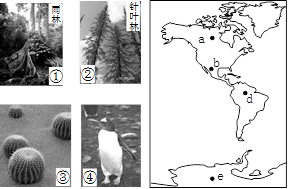 小题4:根据美洲、南极洲的简图可知对应地点、景观是:a—②, b-③,d- ①,e-④。