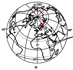 3.读图可以看出②地在60°N纬线圈上,与北极点的纬度差为30°,在同一经线上纬度相差1°,实地距离相差111千米,可计算出②地到北极点的实地距离为30×111千米=3330千米,若甲图中②地和北极点的图上距离为2.22厘米,则甲图的比例尺为2.22厘米︰330千米=1︰150000000,故答案选C。