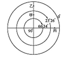 1.图中同心圆表示晨昏线的是2.若图中0°等值线与经线圈重合,则此时太阳直射的纬度 是3.若图中丙地所在直线为北回归线,甲地为伦敦,则乙地所在经线的度数是4.有关此刻太阳高度分布规律的叙述,正确的是