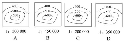 【小题1】图示四图的垂直高差相同,故水平距离越小则表示的坡度越陡,而比例尺越大,表示的实际距离越小,故选B图比例尺最大。