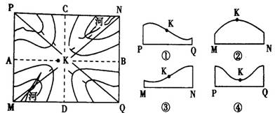 【小题1】从MN方向看,K两侧为河流,故中高周低,与②符合。从PQ沿线看,K两侧为山峰,K处地势低,故④符合。
