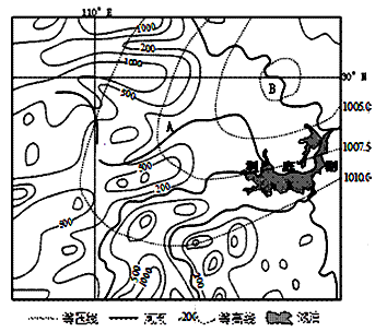 (2)据图根据等高线数值判断:AB此时受锋面气旋控制,天空云层较厚、可能出现阴雨天气。A地位于北半球的气旋左侧低压槽附近,盛行西北(偏西)风,可能形成冷锋。因受冷气团影响,气温不高。B地位于北半球的低压中心附近,风力微弱,气温较高。