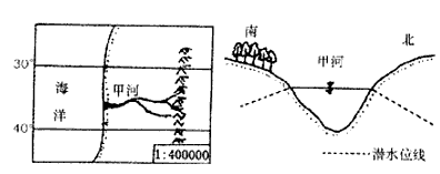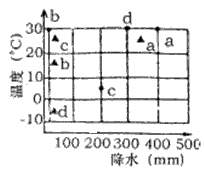 1、上图中a,b,c,d是四个地点1月(▲)和7月(●)气温及降水情况示意图,其中与甲河流域气候类 ? 型相符的地点是 [? ] A、a B、b C、c D、d 2、根据图中信息推知,甲河流域此时 [? ] A、盛行西北风 B、盛行西南风 C、受副热带高气压带控制 D、潜水补给河水