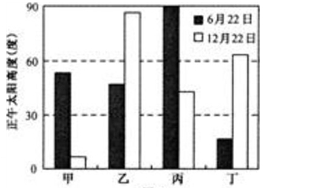 小题1:纬度越低,地球自转线速度越大,从图中可以看出乙地太阳高度角变化较小,而且普遍比较大,甲地不仅变化幅度大,且正午太阳高度角较小,丙地太阳高度角最大可以达到90度,丁地则变化幅度偏大,因此答案为B。