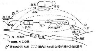 【小题1】根据水的社会循环的含义判断,排除A;水的社会循环在不断的利用地下径流和地表径流,延缓水的自然循环,B错误;对陆地水具有更新作用的为海陆间的水循环,而水的社会循环一定程度上使得河流等自然水体中的水量,对水的更新作用小,排除C;在水的社会循环中,可以造成对水循环的不利影响如污染等,D正确。