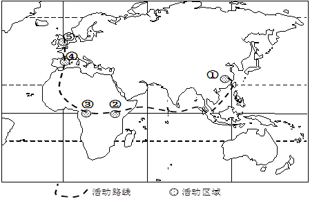 4、单选题 图为某代表团的亚、欧、非考察路线图和活动区域。据此回答题。