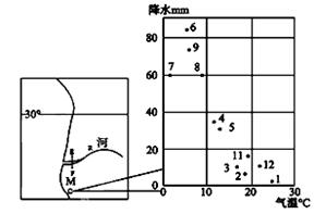 本题解析:该地位于30度附近,为热带草原气候(北半球)或地中海气候(南半球),从右图中可以看出,该地1月份高温少雨,7月份温和多雨,降水季节变化较大,说明为地中海气候,位于南半球,1月份该地受副热带高压带控制,7月份西风带控制。