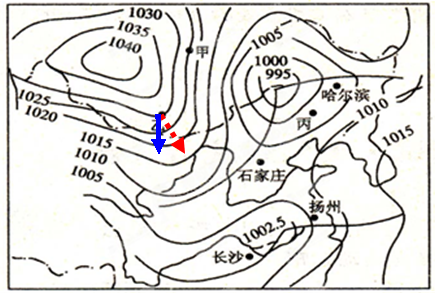 第(2)题,图中甲、乙、丙三处中风力最大的甲处,因为甲处等压线最稠密,气压梯度最大,故风力最大;乙处的风向为偏北风,如下图中所示,红色箭头表示垂直于等压线的水平气压梯度力,蓝色箭头为风向。