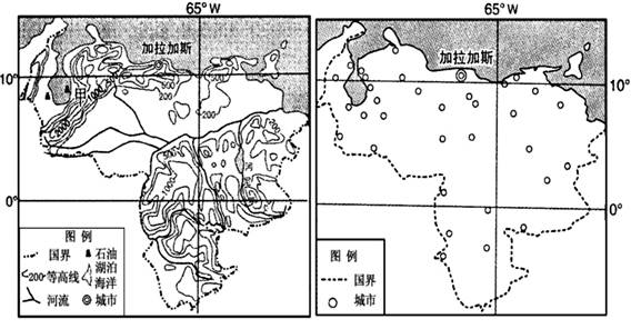 (1)由图中经纬度可知,该国为委内瑞拉,根据图中等高线分布特点,甲处等高线密集,海拔较高;地形以山地为主;坡度大;山脉大致呈东北一西南走向。