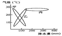 2、单选题 如图是根据甲、乙、丙三地各月平均气温和各月平均降水量所作的区间统计图,读图完成问题。