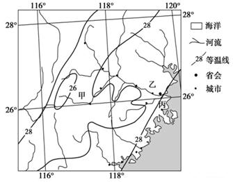 (1)根据该地地理位置可判断出图示区域主要为福建,主要山脉是武夷山。图中甲附近气温低,为山地位置。根据图中28°C等温线大致呈东北-西南走向,结合图中河流流向可推断出山地走向为东北-西南向。