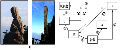 2、单选题 “东方女神”、“巨蟒出山”(如图甲)是江西三清山标志性景观,该景观为花岗岩山岳地貌。图乙为“地壳物质循环示意图”,读图完成下列小题。