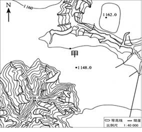 【小题1】图示地区中部和东北都是海拔高而平坦的高原地形,甲地西南侧密集的等高线表示谷地海拔低,甲处的等高线弯向南侧海拔在1148.0的高原,甲处的海拔低于1148.0,甲处北侧等高线1160.0,可判断甲的海拔为1140.0.选B正确。