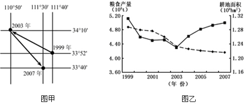 4、单选题 图甲为1999~2007年我国耕地减少的重心转移示意图,图乙为1999~2007年我国耕地面积与粮食产量变化曲线图。读图完成下列各题。