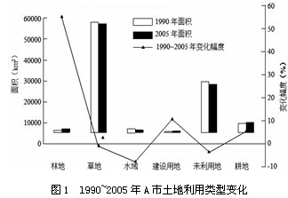 (1)概述A市1990~2005年农业用地类型特点及其变化情况。