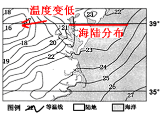 【小题2】图中39°纬线上等温线的分布,陆地与海洋上的温度差异是由于海陆分布不同造成的;在图中39°纬线的西部,等温线发生呈半封闭状,愈向中心,温度愈低,如下图,说明地势愈高,故选项B正确。