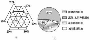 5、单选题 图甲中M点表示我国某县2010年农产品产值构成(其中a表示花卉,b表示蔬菜、水果,c表示粮食);图乙为该县“十二五”农业土地规划,读图回答问题。