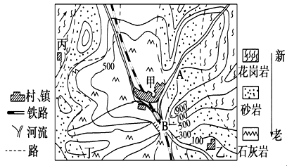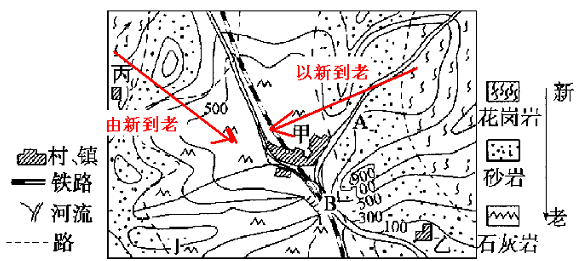 (1)仔细读图,注意图中有岩石的新老关系;在常见地质构造中,与岩石新老关系有关的只有背斜和向斜,背斜是中间岩层老,两翼岩层新,向斜则相反。由图可知该处地质构造应该是背斜,新老关系见下图。由图中等高线数值变化可知甲地地貌类型为小盆地;该处地质构造为背斜,早期地貌应该为山岭,后期由于外力侵蚀(溶蚀)而形成盆地。