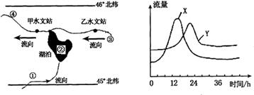 3、单选题 下左图为某流域水系分布示意图,下右图为该流域内一次局地暴雨前后甲、乙两水文站观测到的河流流量变化曲线示意图。读图完成下列问题。?