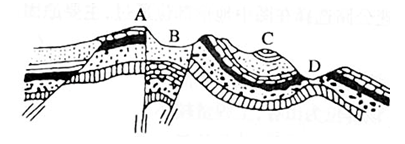(1)A、B、C、D四处在地质构造上的名称分别是