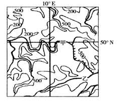 小题1:根据图示的经纬度和河流分布判断该地区位于德国附近,两条河流为莱茵河和多瑙河,流向不一致,地形东南高,西北低,位于温带海洋性气候区,全年温和湿润,河流无冰期,河流以雨水补给为主,径流变化小。所以本题选择D选项。