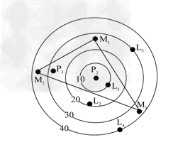 2.P2是企业乙的运费最低点。以P2点为圆心的同心圆是企业乙的等运费线,即企业乙从P2点移动而产生的单位产品运费(货币单位:元)增加额相同点的连线。假设劳动力费用(货币单位:元)从P2点向周围降低,生产单位产品所需劳动力费用在P2点为50元,L1点为42元,L2点为28元,L3点为20元,L4点为15元。当综合考虑运费和劳动力费用时,企业乙将从P2点移向