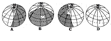 (3)有一架飞机此刻要从A图中的甲点沿最近距离飞到C图中的丙点,飞机的飞行方向是?。 (4)把此刻的昼夜分布情况画到图上。 ![]() 参考答案:(1)C? (2)甲>丙>乙>丁?丙>乙>丁>甲? (3)先东北,后东南? (4)见下图。(2分,得分必须同时满足下列条件;弧线经过图中ABC三点;上半部着色) 本题解析:第(1)题,考查空间想像能力。读图可知A图是从(23.5°N,150°W)上空观测的,B图是从(23.5°N,60°W)上空观测的,C图是从(23.5°N,30°E)上空观测的,D图是从(23.5°N,1 20°E)上空观测的。判断依据是依据杭州为12点及图中经线地方时计算出图中经线的经度即可。 本题难度:一般 2、单选题 下列四天中,符合“太阳直射点正向北移,但仍在南半球”这一事实的是 参考答案:B 本题解析:结合全年的太阳直射点移动规律图示判断,5月1日,太阳直射点位于北半球,并向北移;1月1日,已经经过冬至日,故太阳直射点位于南半球,并向北移;6月1日,还未到夏至日,太阳直射点位于北半球,并向北移;10月1日,已经过了秋分日,太阳直射点位于南半球,并向南移,故选B项。 本题难度:简单 3、单选题 中国日报网环球在线消息:据英国《每日邮报》2009年9月16日报道,天文学家宣布该图为2009年7月22日发生日全食时太阳、地球和月球位置示意图。读图回答问题。 |