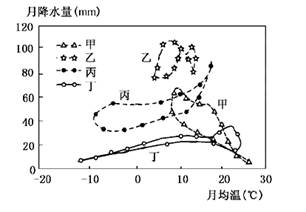 2、单选题 下图为四个气象观测站所记录的气象资料,图中符号代表各站每月的气温和降水量。读图回答下列各题。