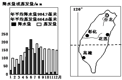 4、单选题 下图中的甲为“台湾某海岸地区的月降水量和月蒸发量分布图”,乙为“台湾四城市位置图”读图回答下题。