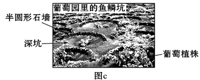 材料二 兰萨罗特岛游记摘录:岛上到处都是环形的山,大片大片的黑色土壤一望无际,该岛屿植被稀少,只有少许棕榈树和仙人掌,显得异常荒凉,且经常性的多发海雾。岛上出产葡萄、蔬菜、谷物等。这里的葡萄种植用一种特殊的种植技术:单株葡萄种植在单个坑里,坑宽3~4米,坑深1~1.5米,坑边用石块垒成半圆形石墙(见图c:葡萄园里的鱼鳞坑)。