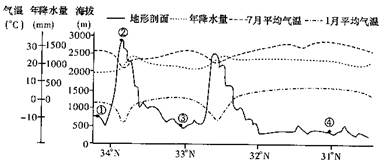 小题3:根据题图所处的经纬度可知,①是渭河平原,②是秦岭,④是四川盆地。④属亚热带季风气候,因山地阻挡,受冬季风影响较小。