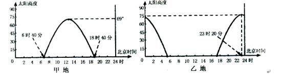3、综合题 我国甲地中学生与南半球乙地中学生在同一天观测太阳高度的变化,并将观测结果绘成下图,甲地学生发现此日测得的最高太阳高度比前一天小。据此回答下列问题。(10分)