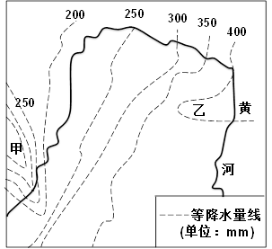 1.甲、乙两地降水量的差值可能是2.甲处附近等降水量线密集的原因是