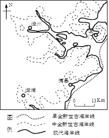 5、单选题 下面为全新世(开始于11.5万年前)以来福建省南部局部沿海海岸变迁状况示意图,读图回答题。