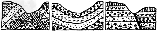 (3)断层;岩层断裂并发生错位;断层面附近岩层破碎,易被风化侵蚀。