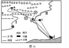 A.有利于保持地域文化的独特性 B.有利于区域产业结构的调整 C.促进区域内旅游业的发展 D.提高区域内矿产资源的外运能力 3、综合题  读图16完成下列任务:(11分) 4、单选题  山区公路呈“之”字形分布的主要目的是 5、单选题  读“某地地理位置示意图和该地的海湾放大图”,最适宜建港口的位置是  |