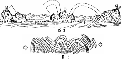 A.板块碰撞一火山喷发 B.多雨多雾一气候温凉 C.海上仙山一地广人稀 D.山青水秀一常绿林广布 参考答案: 本题解析: 本题难度:一般 2、单选题 图2为某地地貌景观图,图3为该地地质构造示意图,读后完成题。 |